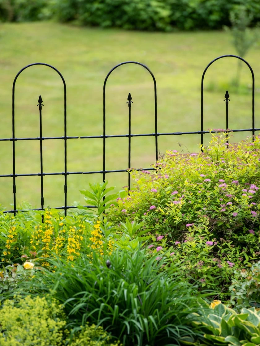 With its classic Roman arches and spear-shaped finials, this charming border panel provides an elegant garden backdrop on its own, or as a trellis, lightly twined with smaller annual vines. Sturdy steel-core design stands straighter and taller than comparable fencing, and polyethylene coating is gentle on plant stems. Setting up and expanding your border by adding more segments is easy too: each double-arch panel connects to the next with the included connector clips.